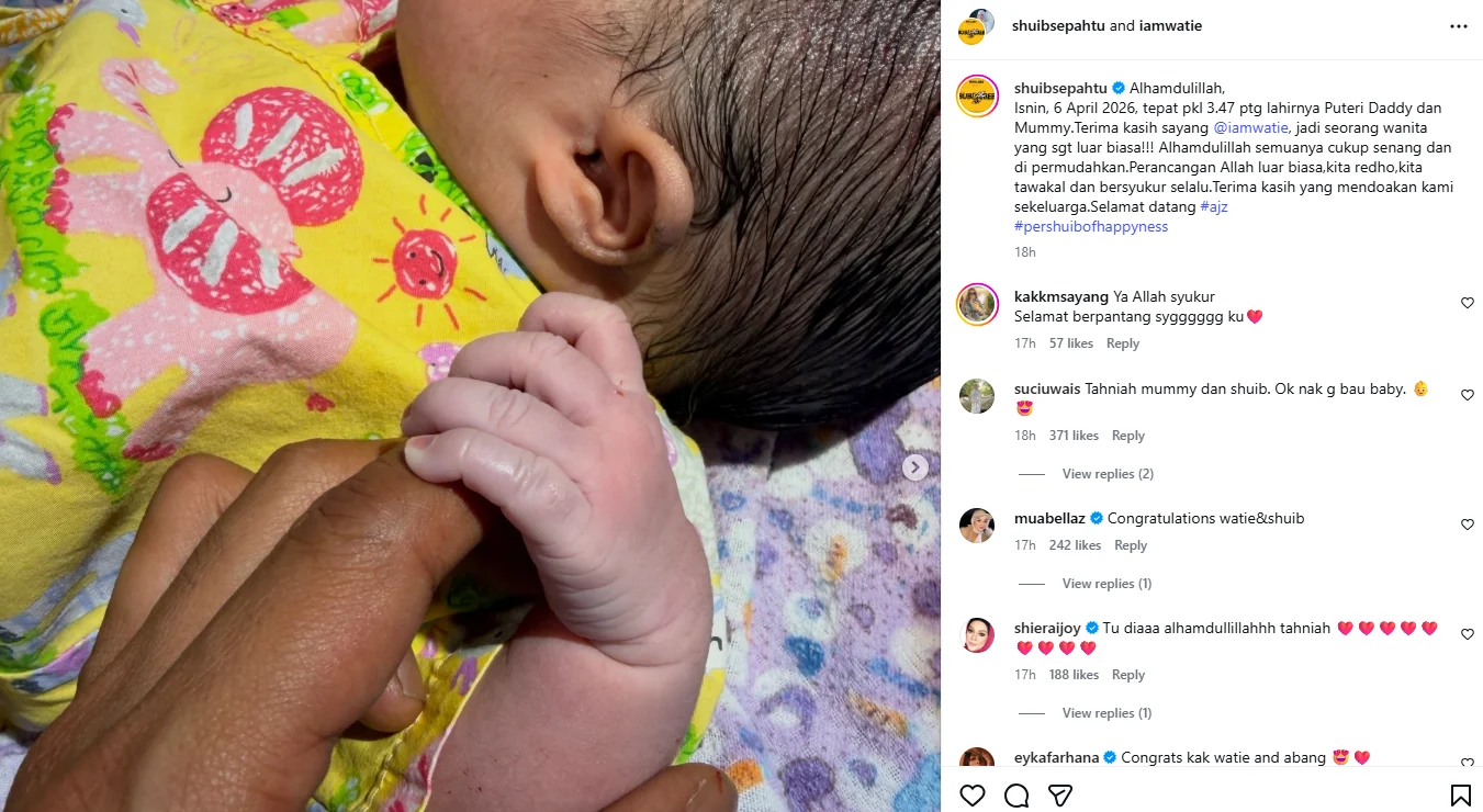 “Alhamdulillah, Isnin, 6 April 2026, tepat pukul 3.47 petang lahirnya Puteri Daddy dan Mummy.Terima kasih sayang @iamwatie, jadi seorang wanita yang sangat luar biasa!!!
