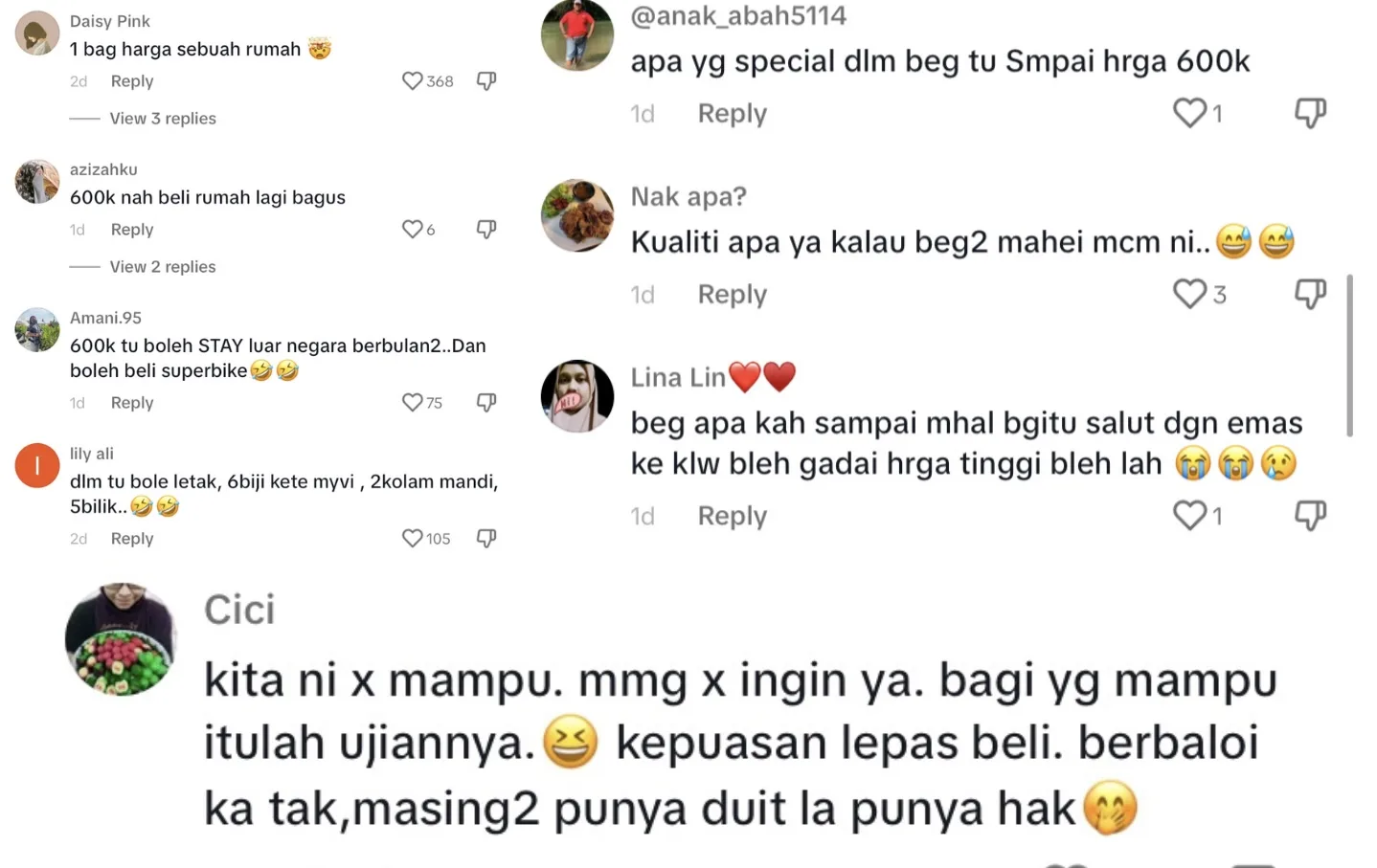 Rata-rata netizen meninggalkan komen bahawa sangat tidak berbaloi untuk membeli beg tangan jenama berkenaan. Kata mereka, alangkah baiknya duit tersebut digunakan kepada perkara yang lebih bermanfaat dan berguna.