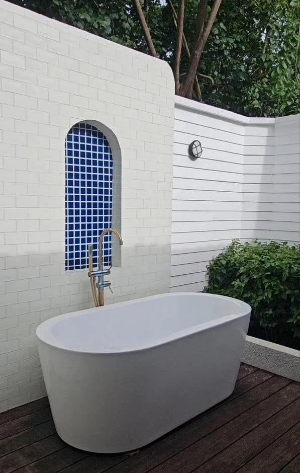 Bilik kami baru diubah suai dan kami sangat menyukai kombinasi warna dan corak yang digunakan. Satu lagi yang paling menarik adalah bilik mandi luar kami, yang memberikan pengalaman yang unik. Kami juga terkejut, selain kolam renang terdapat tab mandi yang menambah keselesaan dan kemewahan penginapan kami.
