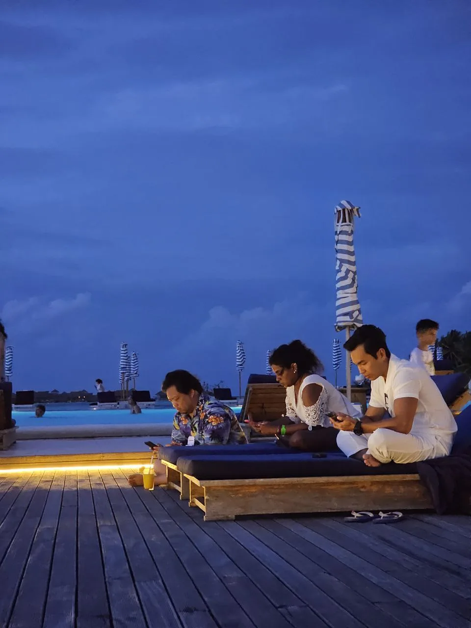 Menjelang waktu makan malam, kami mengambil masa untuk berjalan-jalan menyaksikan matahari terbenam di sekitar pulau. Kami berhenti di Hulhangu Bar yang terletak di sebelah kolam renang, di mana reka bentuk dan suasana bar tersebut menawan hati kami.