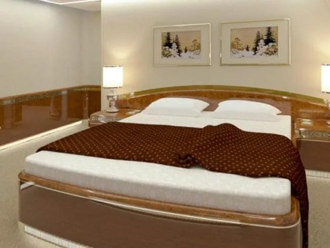 Interior bilik tidur dan bilik mandi di pesawat seluas 370 meter persegi itu juga mewah bak hotel 5 bintang. Warnanya pun senada dengan warna kabin. Bilik tidurnya terlihat sangat selesa. Lebih uniknya di bahagian bilik mandi, almarinya berwarna emas. Namun tidak dipastikan samaada emas asli atau tidak.
