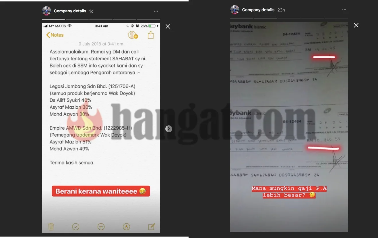 Menguatkan lagi dakwaan berkenaan, Asyaf sendiri telah tampil mengemukakan beberapa salinan bukti di Instagram nya yang menunjukkan bahawa dia adalah pemegang saham terbesar dalam perniagaan Wak. Turut kelihatan di situ adalah Datuk Seri Aliff Syukri sebagai pemegang saham bersama.