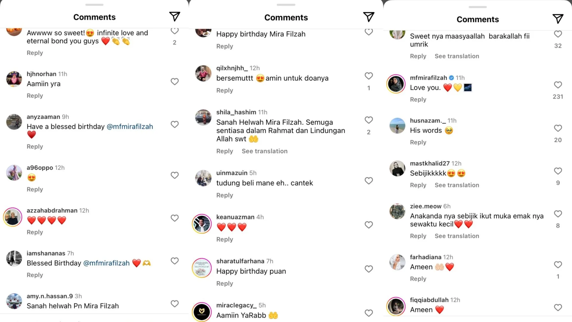 Kepada Allah SWT ku pohon, agar dirimu sentiasa berada dalam perlindungan, rahmat, dan keredhaan-Nya. Saya juga memohon kebaikan sahabat semua agar mendoakan Mira — moga panjang umur, kesihatan berpanjangan, selamat dan berjaya di dunia & akhirat bersama keluarga, aamin YRA. Selamat Ulangtahun Kelahiran kekasihku @mfmirafilzah.??.”-titip Emir buat Mira