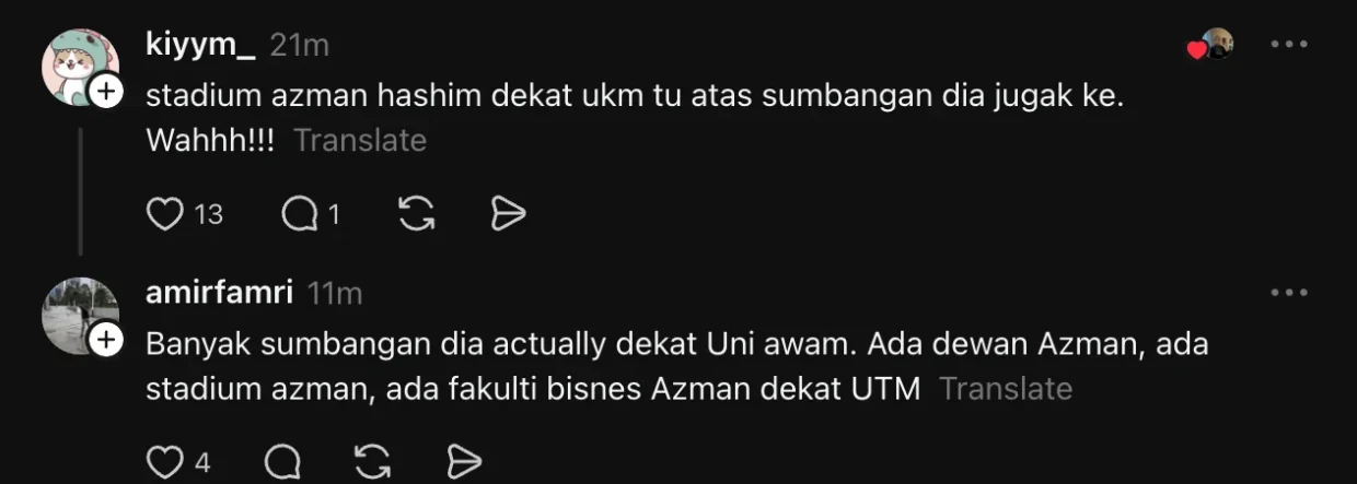 Tidak kurang juga yang berkongsi info tentang sumbangan besar Tan Sri Azman kepada institusi pendidikan tempatan, termasuk pembinaan kemudahan seperti stadium, dewan dan fakulti di universiti awam.
