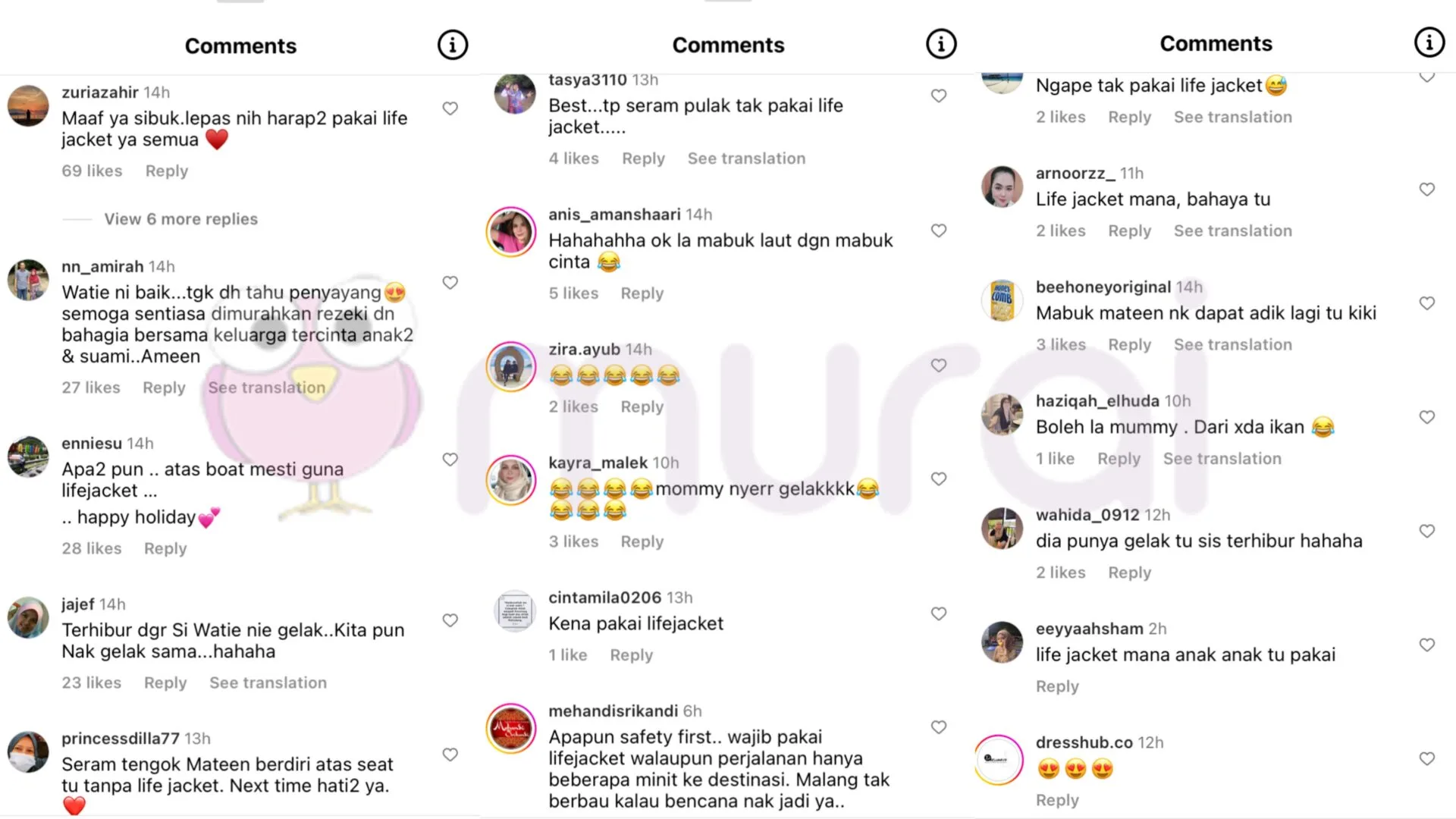 Di sebalik kegembiraan keluarga ini menghabiskan masa bersama, sesetengah netizen dilihat memberikan teguran apabila melihat Watie sekeluarga tidak memakai jaket keselamatan ketika menaiki bot.