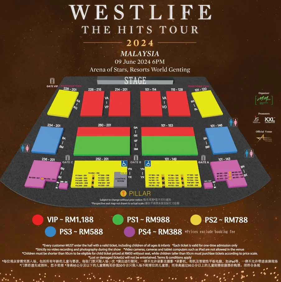 Tiket ke Westlife The Hits Tour 2024 berharga RM1,188 (VIP), RM988 (PS1), RM788 (PS2), RM588 (PS3) dan RM388 (PS4), tertakluk kepada yuran pemprosesan RM4.