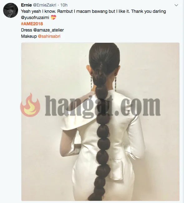 Selain daripada itu, Ernie turut menerima kecaman netizen apabila dandanan rambutnya pada malam itu kelihatan seperti bawang. Akuinya sambil berseloroh, Ernie tetap memuji jurusolek yang membuat dandanan rambutnya.