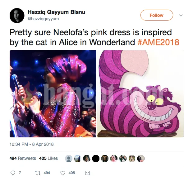 Melihatkan pakaian Neelofa pada malam itu seperti ada sahaja yang tidak kena. Bermula dengan turban yang dipakai Lofa seperti kain veil yang membalut hamper, pakaiannya juga persis kucing di dalam filem Alice In The Wonderland.