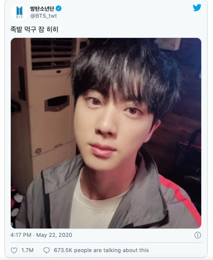 Setelah selfie itu dimuatnaik, Jin langsung menjadi berita utama paling popular di Nate News. Judul artikel itu berbunyi, “Jin BTS, Terlihat Tampan Bahkan Saat Wajahnya Kembong Kerana Makan Jokbal ‘Visual Tampan Bahkan Setelah Tidur.’