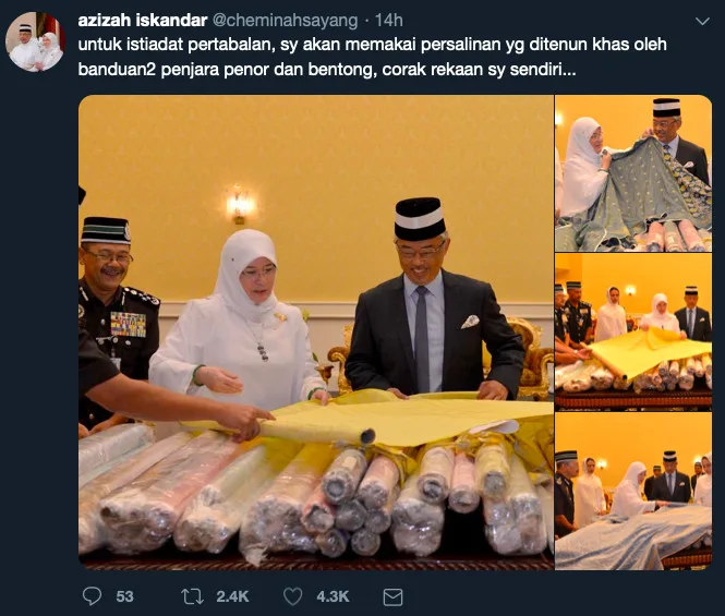 Menghargai hasil tenunan tersebut, Tunku Azizah menerusi laman Twitter nya telah menyatakan bahawa baginda akan memakai persalinan diraja hasil tenunan oleh banduan-banduan dari Penjara Penor dan Penjara Bentong bersempena hari pertabalan Agong tidak lama lagi.