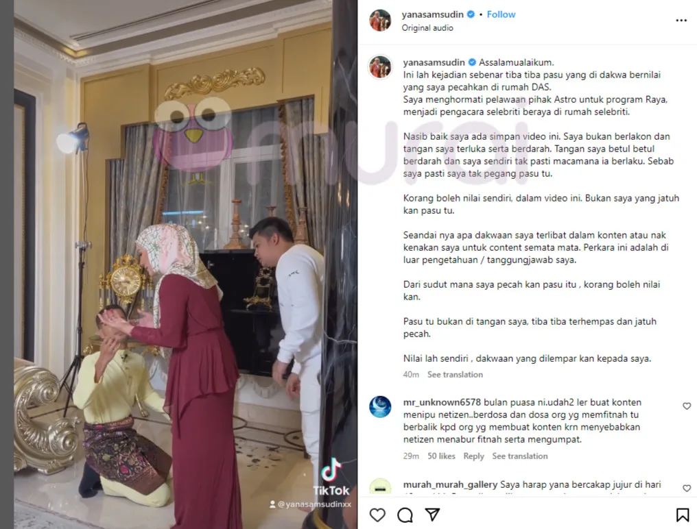 Dalam video yang telah tular semalam, Yana dikatakan terpecahkan pasu hiasan yang bernilai ratusan ribu ringgit milik Aliff Syukri dalam satu rakaman program raya.