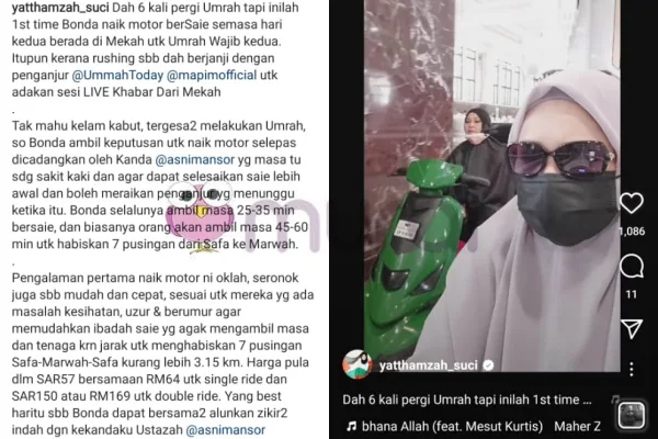 “Dah 6 kali pergi Umra tapi inilah 1st time Bonda naik motor berSaie semasa hari kedua berada di Mekah untuk Umrah Wajib kedua. Itupun kerana rushing sebab dah berjanji dengan penganjur @UmmahToday @mapimofficial untuk adakan sesi LIVE Khabar Dari Mekah.