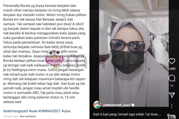 Menerusi perkongsian Yatt di Instagram, dia berpeluang untuk menaiki motor khas buat pertama kali bagi melakukan ibadah saie. Menurut Yatt, kenderaan tersebut biasa digunakan bagi jemaah mempunyai masalah kesihatan, uzur dan jemaah berumur.