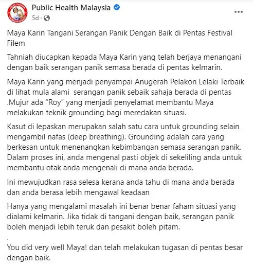 Untuk Maya pula, cara dia mengendalikan serangan panik pada malam tersebut turut mendapat pujian di Facebook rasmi Public Health Malaysia.