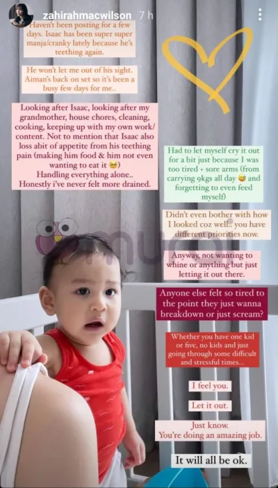 Luahan para isteri yang tertekan kerana terlalu letih mengurus rumahtangga dan kerja, kerap berlaku dalam masyarakat. Dan hal yang sama sedang dilalui oleh pelakon jelita Zahirah Macwilson yang berkongsi serba sedikit tekanan yang dialaminya di Insta Stories.