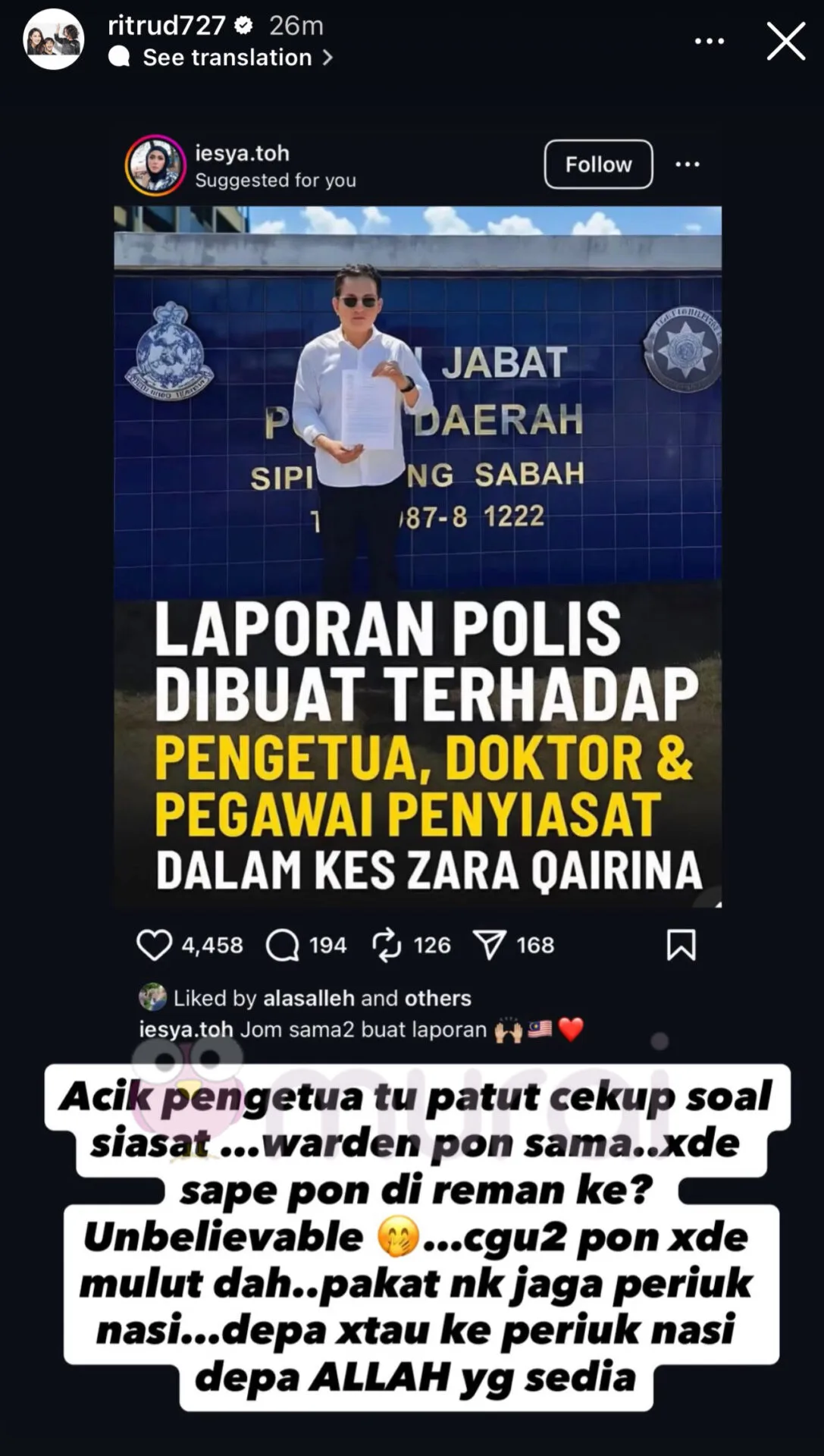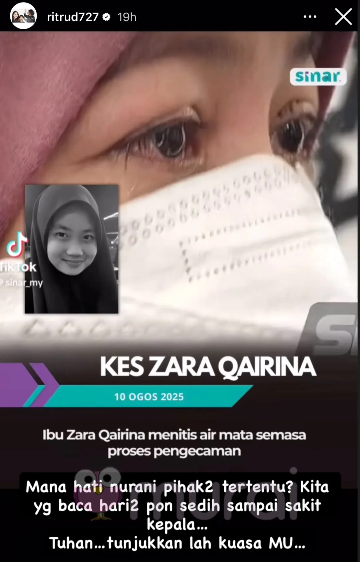 “Mana hati nurani pihak-pihak tertentu? Kita yang baca hari-hari ni pun sedih sampai sakit kepala. Tuhan tunjukkan lah kuasa Mu.”-tulis Rita di Insta Stories