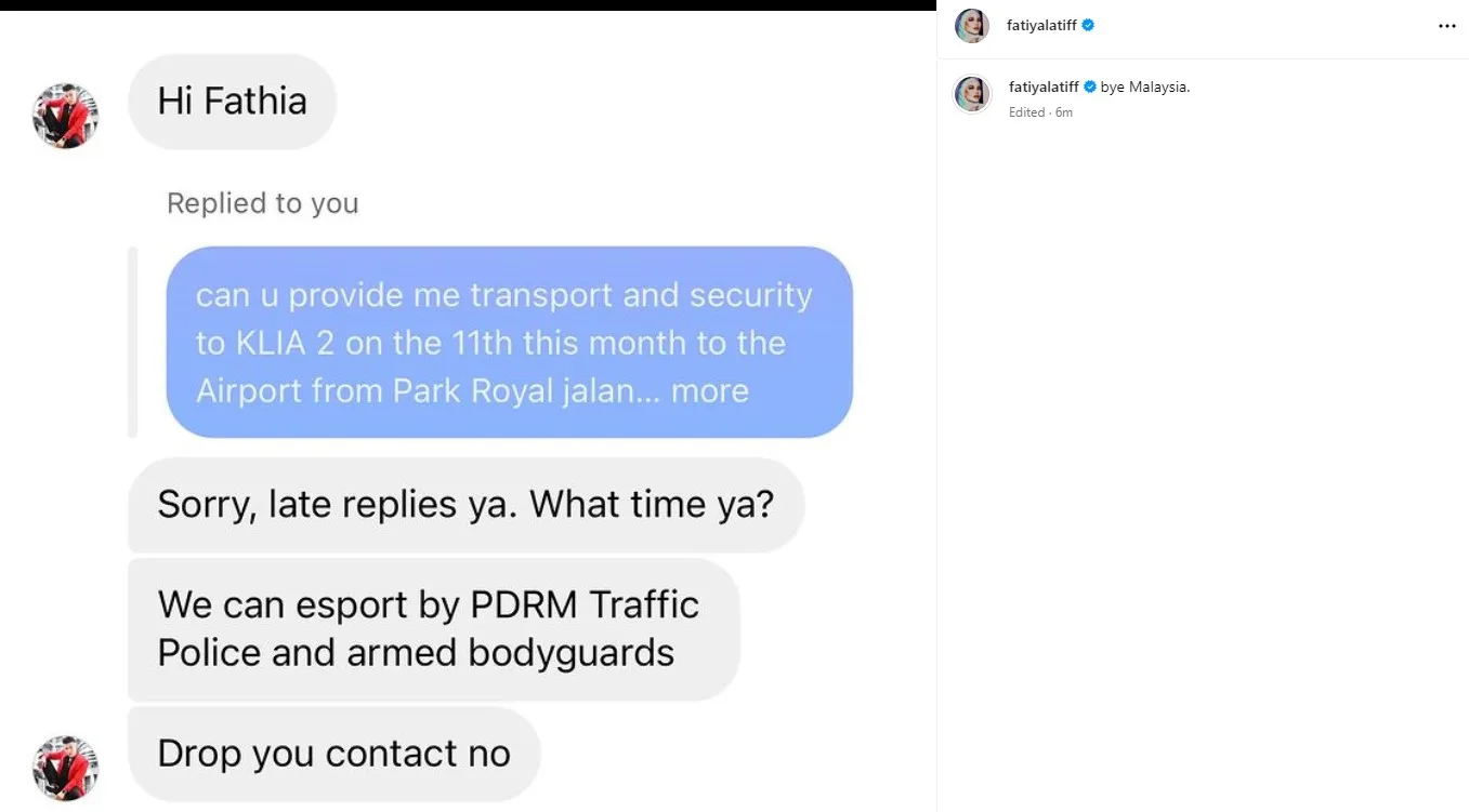 Dalam pada itu, Fathia menerusi tangkap layar yang dimuatnaik di Instagram, turut memaparkan diri yang mencari servis pengangkutan dan keselamatan dirinya untuk ke Lapangan Antarabangsa Kuala Lumpur pada esok hari, seolah-olah memberikan ‘hint’ bakal meninggalkan Malaysia.