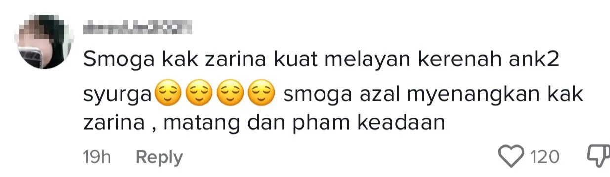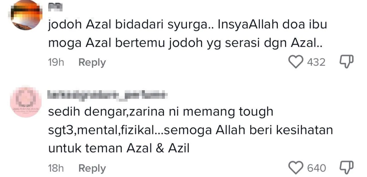 Menjengah ke ruangan komen, rata-rata warganet memuji kekuatan seseorang yang bergelar ibu seperti Zarina ini sebagai tabah dan meminta pelakon itu tidak berputus harapan, malah ada jugak yang menitipkan doa buat insan istimewa itu untuk mendapat jodoh yang baik.