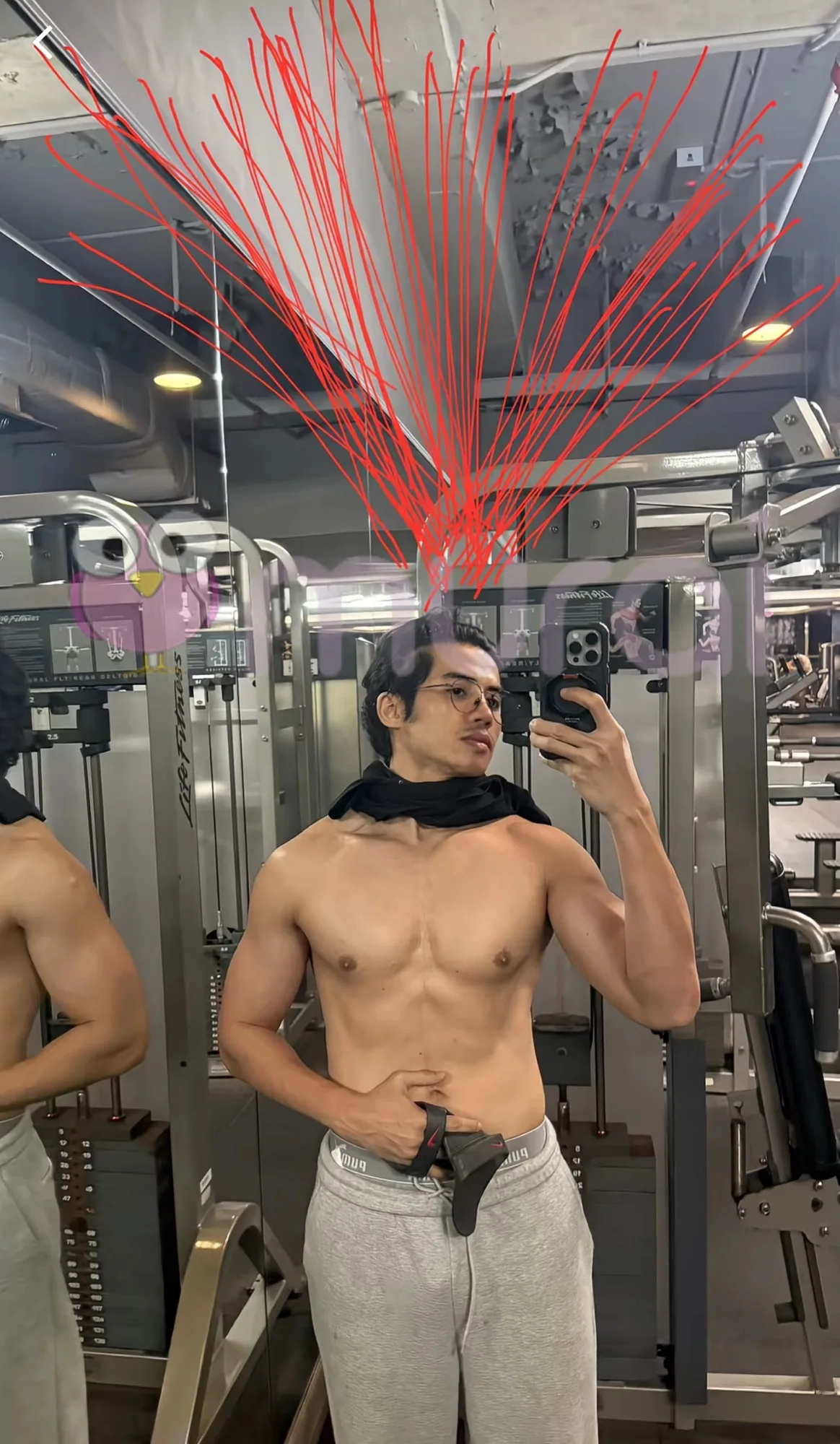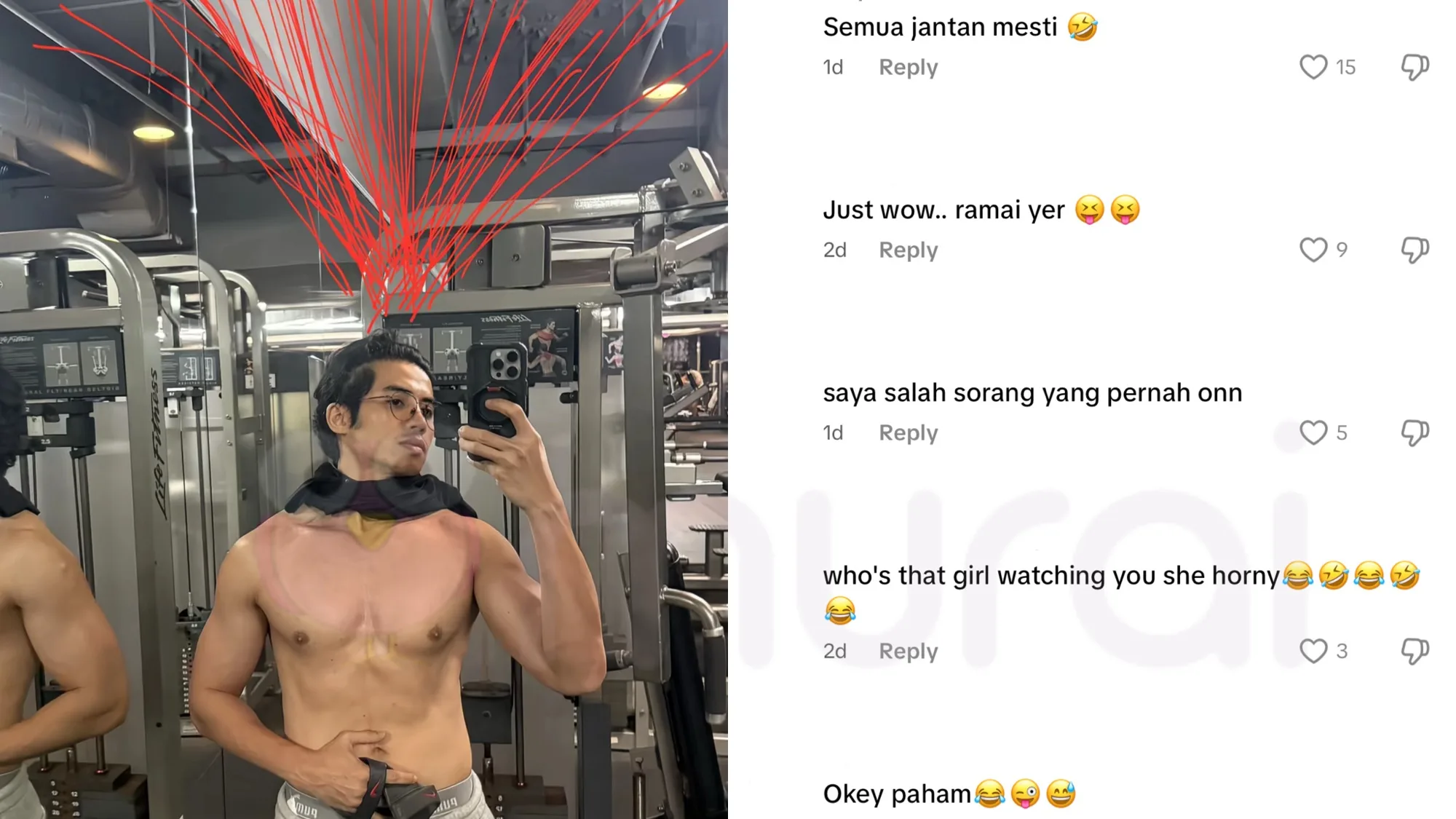 Zoey Rahman, menerusi foto dirinya yang tidak mengenakan pakaian ketika berada di gimnasium yang dimuatnaik di TikTok, turut memaparkan beberapa garisan merah yang dilukis atas kepalanya.