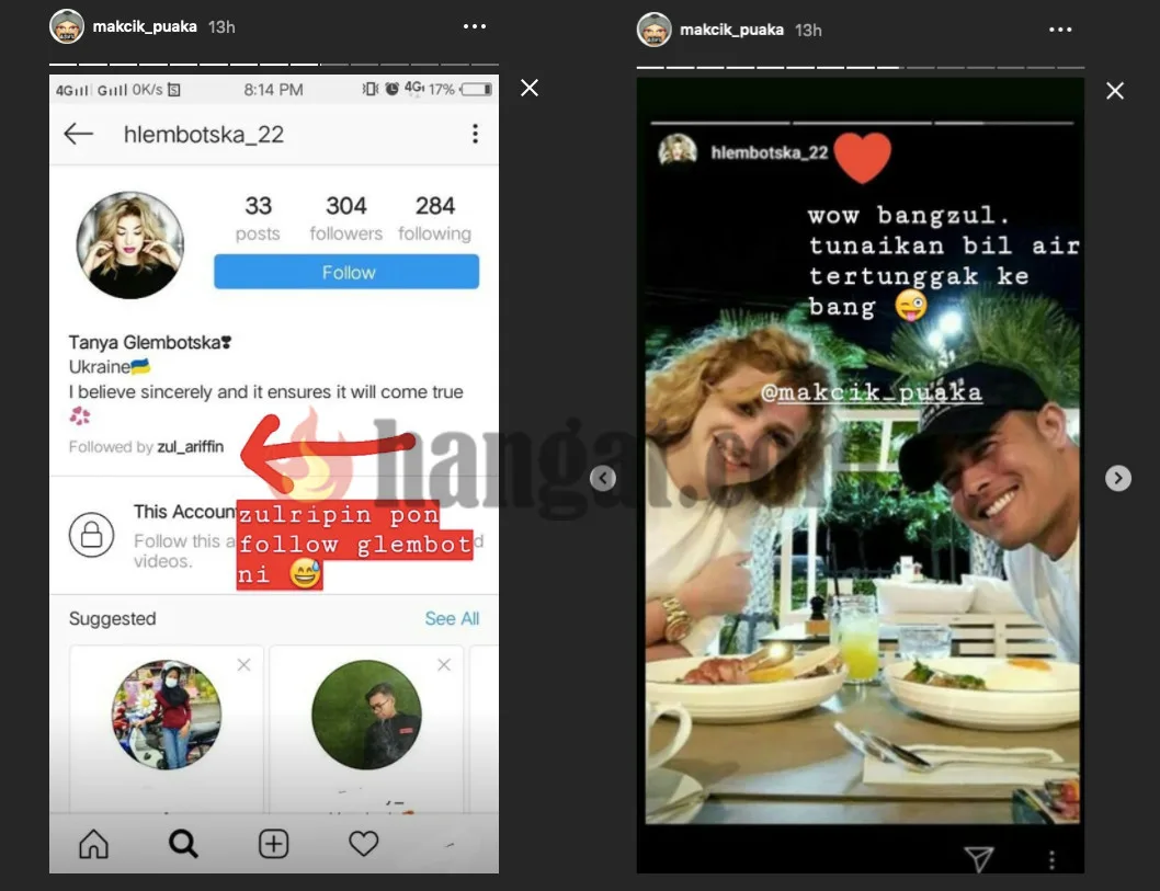 Selain mengikuti akaun IG Zul Ariffin, Glembotska juga memuat naik gambar memeluk seorang jejaka yang dipercayai pelakon J Revolusi berkenaan. Gadis itu turut memuatnaik gambar ukiran tatu yang memaparkan nama Zul di jari manisnya.