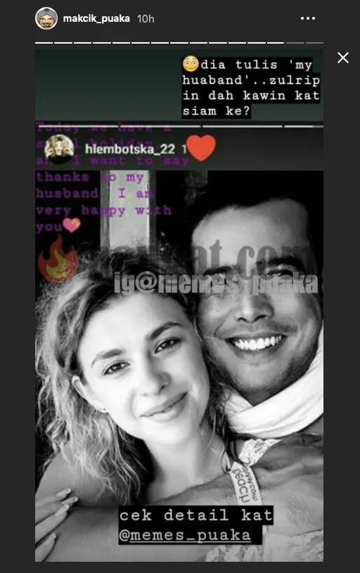 Bagaimanapun, Zul Ariffin tampil menafikan dirinya berkahwin dengan gadis yang difahamkan seorang model menjadi tular gara-gara foto romantis dipercayai dimuatnaik Glembotska dalam IG Story beliau.